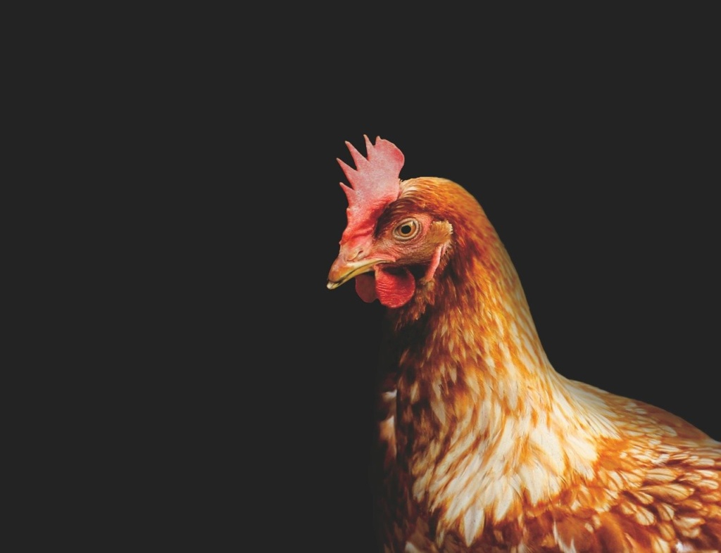 - der Kopf des Huhns schief gedreht wirkt und